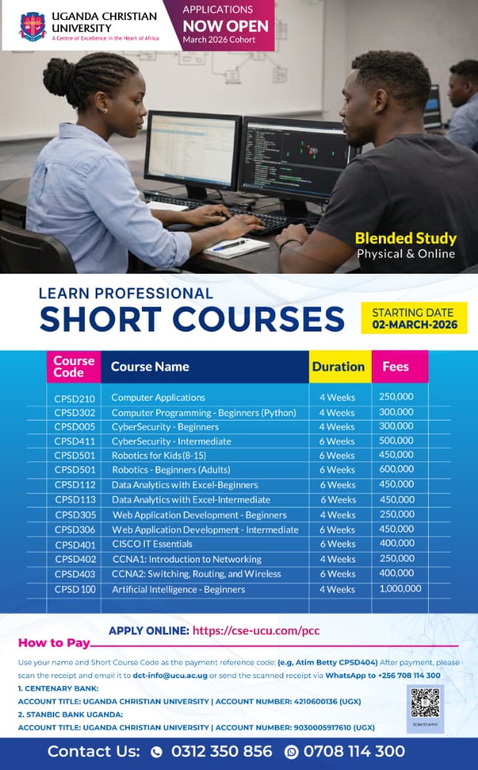 Short courses for Continuous Professional Development (CPD) are now available for prospective students in 2026 at the Department of Computing and Technology of Uganda Christian University. These courses cover a wide range of topics, from fundamental computing skills to advanced applications in areas like Analytics, business accounting, Graphics design, Game Engineering, Programming, Networking, CyberSecurity, Robotics for Children under 15 years, and Coding for Children. Interested individuals are encouraged to submit their applications online without delay. Click here to apply.