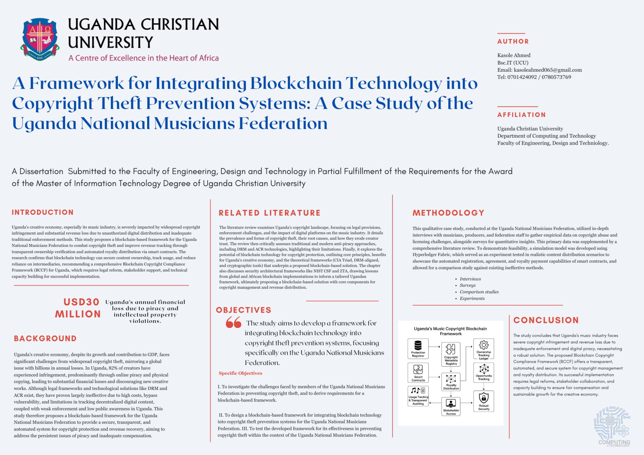 Key outcomes show that this solution can reduce piracy risks, improve artists’ revenue streams, and build trust among creators, distributors, and regulators. Ultimately, this work lays the foundation for integrating advanced technologies into intellectual property management, positioning Uganda as a regional leader in digital copyright protection.